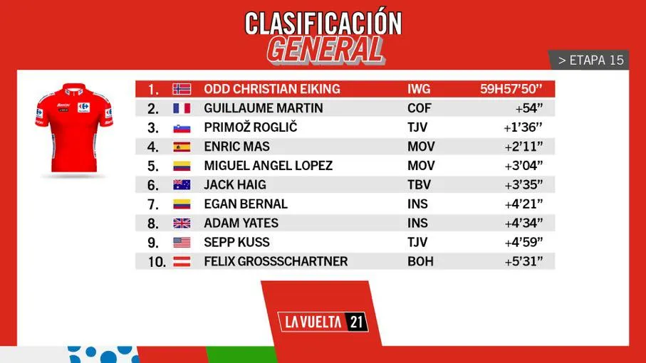 Nhóm tay đua mạnh có áo đỏ Odd Christian Eiking về đích sau Rafal Majka 2 phút 57 giây. Nhưng nhờ kèm chặt được những đối thủ cạnh tranh trực tiếp trên bảng tổng sắp như Guillaume Martin (Cofidis), Primoz Roglic (Jumbo-Visma), Enric Mas Nicolau (Movistar),… nên Odd Christian Eiking vẫn giữ được áo đỏ tổng sắp với thành tích 59 giờ 57 phút 50 giây.