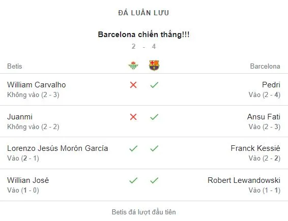 ⚽ Tỷ số chung cuộc: Barcelona thắng luân lưu Real Betis 4-2