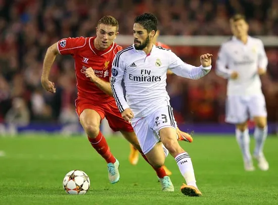 Isco (phải, Real) đi bóng qua Henderson (Liverpool).