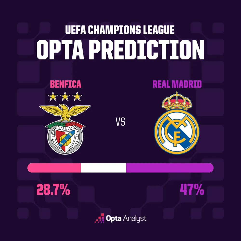 Theo mô phỏng của siêu máy tính Opta – dựa trên 10.000 lần chạy kịch bản trước trận – Real Madrid vẫn là đội được đánh giá cao hơn, với 47 % khả năng giành chiến thắng ở lượt đi trên sân Benfica. Trong khi đó, đội chủ nhà Bồ Đào Nha có tỷ lệ 28,7 % và 24,3 % kết quả hòa.