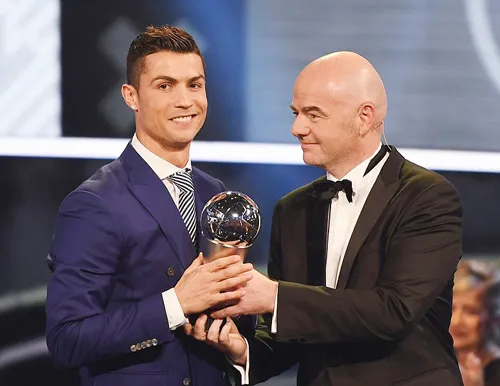 Chủ tịch FIFA Gianni Infantino trao danh hiệu Cầu thủ xuất sắc nhất năm cho Ronaldo. Ảnh: FIFA