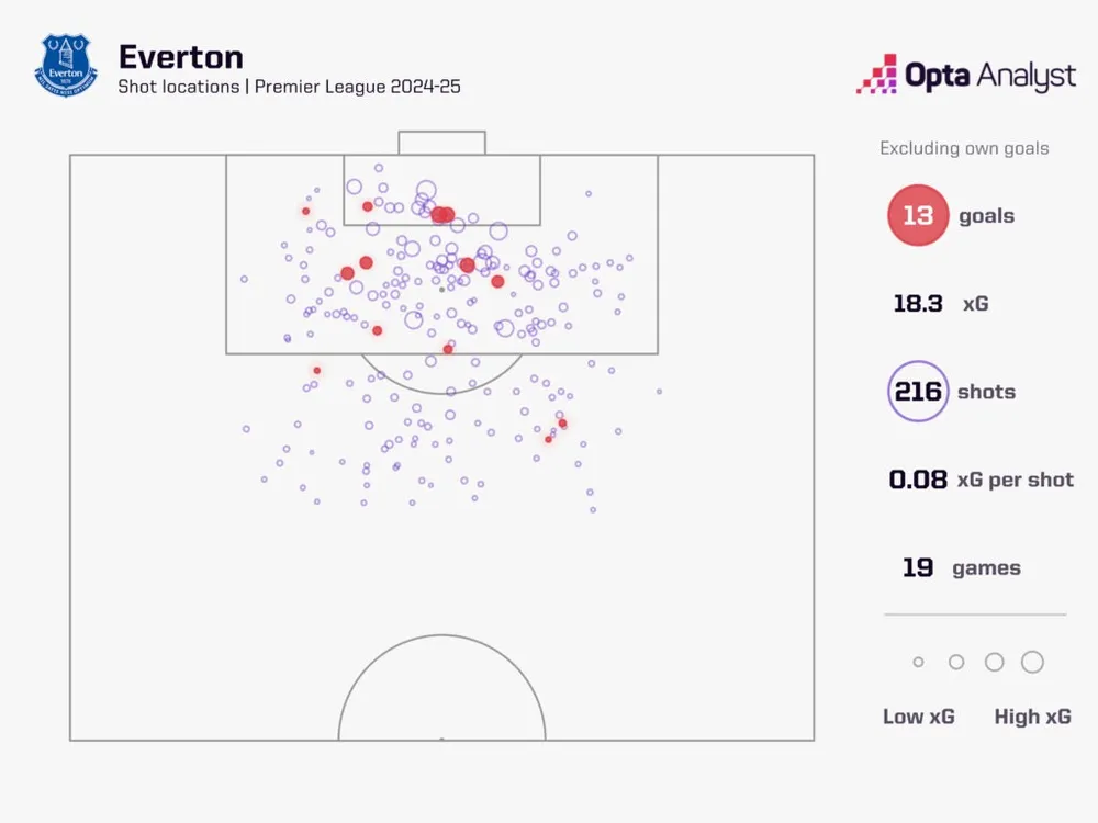 Vì vậy, có lẽ sẽ không quá ngạc nhiên khi biết rằng họ chỉ ghi được nhiều bàn thắng hơn (15) trong mùa giải này so với đội cuối bảng Southampton. Tương tự như vậy, Southampton (6,4%) cũng là câu lạc bộ duy nhất có tỷ lệ chuyển đổi cú sút kém hơn Everton (6,9%).