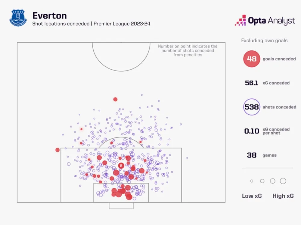 Nhưng không chỉ là trường hợp dứt điểm kém. Sự sáng tạo đã bị thiếu hụt nghiêm trọng. Và không phải là Everton không có những cầu thủ có khả năng ở phần ba cuối sân; Dwight McNeil , Iliman Ndiaye , Jack Harrison và Jesper Lindstrøm đều là những người tài năng. Chỉ số 18,3 xG (bàn thắng dự kiến) sau 19 trận của Everton là thấp nhất trong số tất cả các câu lạc bộ tại giải đấu này mùa này. Vì vậy, họ không chỉ gặp khó khăn trong việc tạo ra những cơ hội rõ ràng mà còn cực kỳ kém hiệu quả trong việc chuyển hóa các cơ hội đến với mình – nỗ lực của họ cũng sẽ không được hỗ trợ bởi việc họ là đội có số lần chạm bóng ít thứ ba trong vòng cấm của đối phương (388).