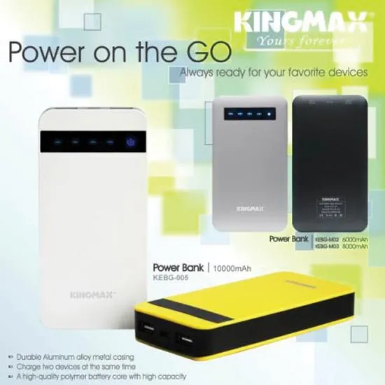 Có thể kể đến một giải pháp của Kingmax với sạc di động KEBG-005 có dung lượng 10.000mAh. Kết quả thử nghiệm cho thấy KEBG-005 có khả năng sạc iPhone 6 đầy 4 lần. Với 2 cổng xuất 2,1A của KEBG-005, bạn có thể sạc 2 thiết bị cùng lúc.
