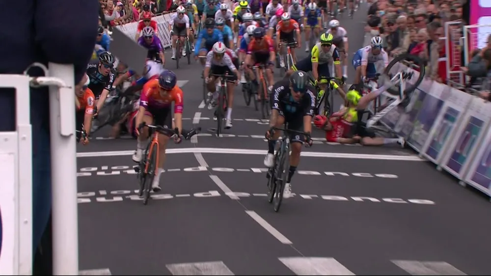 Trong quá trình tung nước rút về đích, Sam Welsford được cho là “chuyển hướng bất thường sang trái”. Hành động của tay đua người Australia đã ép xe khiến tay đua người Bỉ Arnaud De Lie (Lottto-Soudal) bị té ngã. Dan McLay (Arkea-Samsic) đang chạy phía trong bên trái, sát những tấm panô đã bị kéo ngã theo cùng Arnaud De Lie.