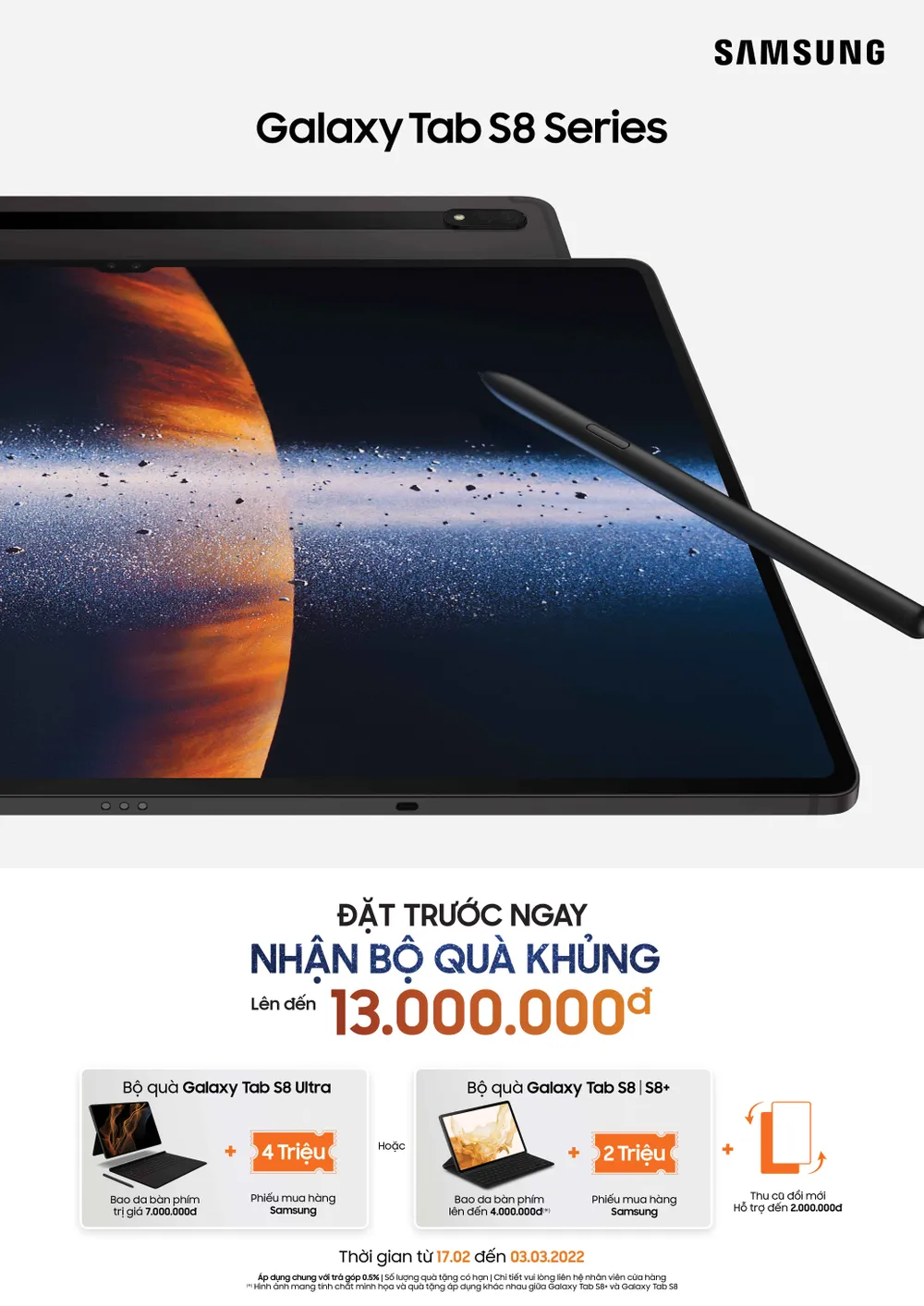 Từ ngày 17-2 đến 3-3, khách hàng được hưởng ưu đãi hấp dẫn khi đặt trước Galaxy Tab S8 Series tại các hệ thống bản lẻ với gói ưu đãi 8 triệu - 13 triệu đồng (gồm: 1 bao da bàn phím, 1 phiếu mua hàng Samsung và gói thu cũ đổi mới hỗ trợ đến 2 triệu đồng). Nếu đặt trước trên trang thương mại điện tử Samsung Việt Nam, khách hàng được nhận gói ưu đãi đến 13 triệu đồng (gồm: 1 bao da bàn phím, tích 5% điểm Galaxy Rewards, 1 tai nghe Galaxy Buds Pro khi đặt mua Galaxy Tab S8 Ultra hoặc 1 phiếu mua hàng trị giá 2 triệu đồng khi đặt mua Galaxy Tab S8, Galaxy Tab S8+).