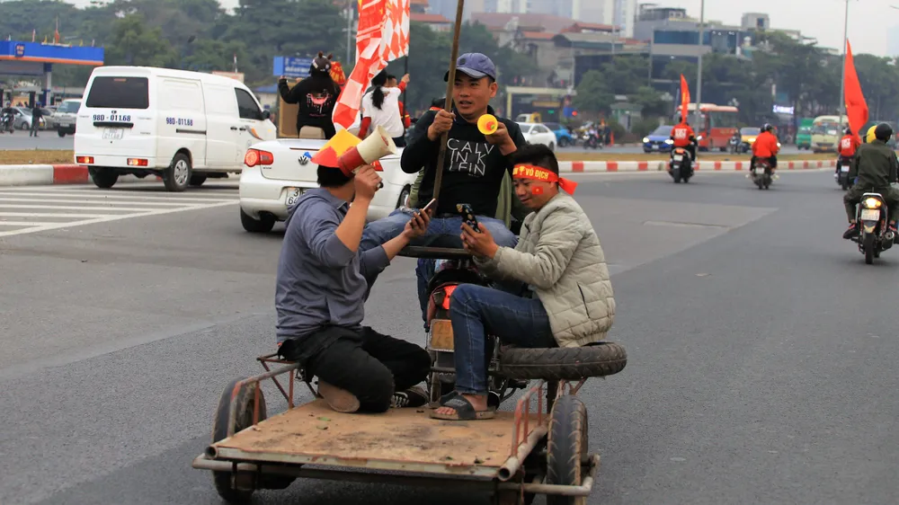 Từ 17g chiều, trên cung đường Lê Đức Thọ - Lê Quang Đạo dài 3km, bầu không khí lễ hội bóng đá được giới mộ điệu Việt Nam tạo ra. Đoàn xe “nối đuôi” nhau diễu hành, chở khoảng 100 CĐV nước nhà khoác lên sắc đỏ rực rỡ hoà cùng tiếng kèn, tiếng loa phát thanh và hô to “Việt Nam vô địch - Việt Nam vô địch” vang vọng tuyến phố.