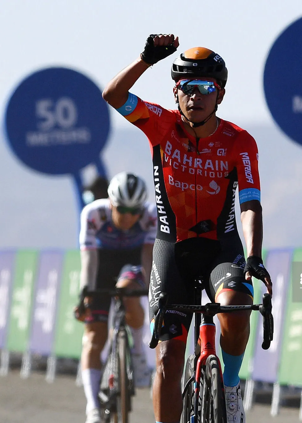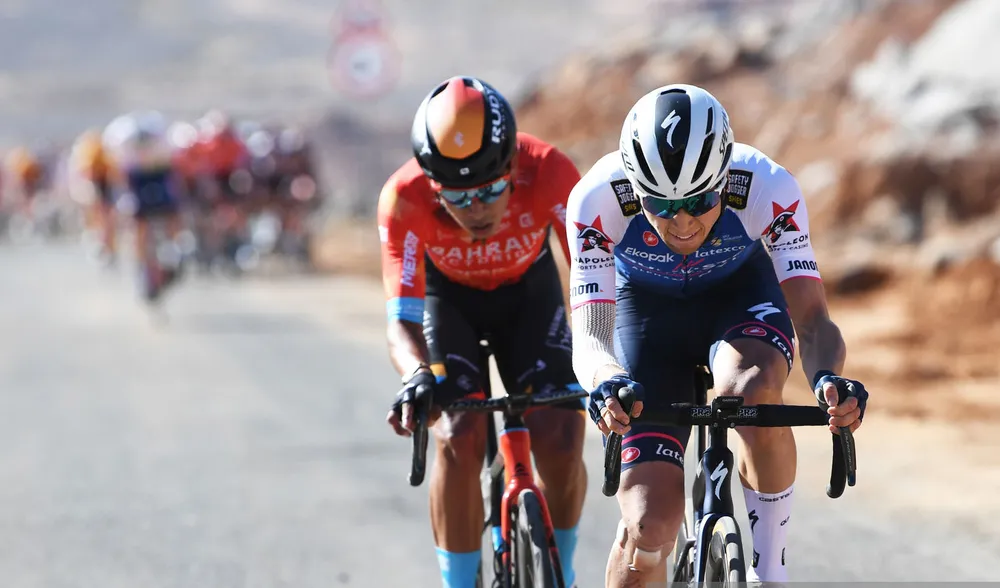 Và “thần núi” 22 tuổi của đội Bahrain-Victorious đã chủ động tấn công ở ngoài 1km cuối, khi nhóm đông đi đầu bắt đầu vào một con dốc dài nhiều sỏi đá giữa sa mạc. Tuy nhiên, Santiago Buitrago chỉ tạo được khoảng cách nhỏ so với đoàn đông.