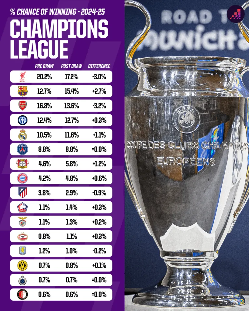 Inter Milan vẫn là ứng cử viên vô địch thứ tư, với cơ hội vô địch gần như không thay đổi sau lễ bốc thăm (12,7%). Cơ hội của PSG (8,8%) cũng không thay đổi. Bảy đội còn lại vẫn có cơ hội dưới 1,5%.
