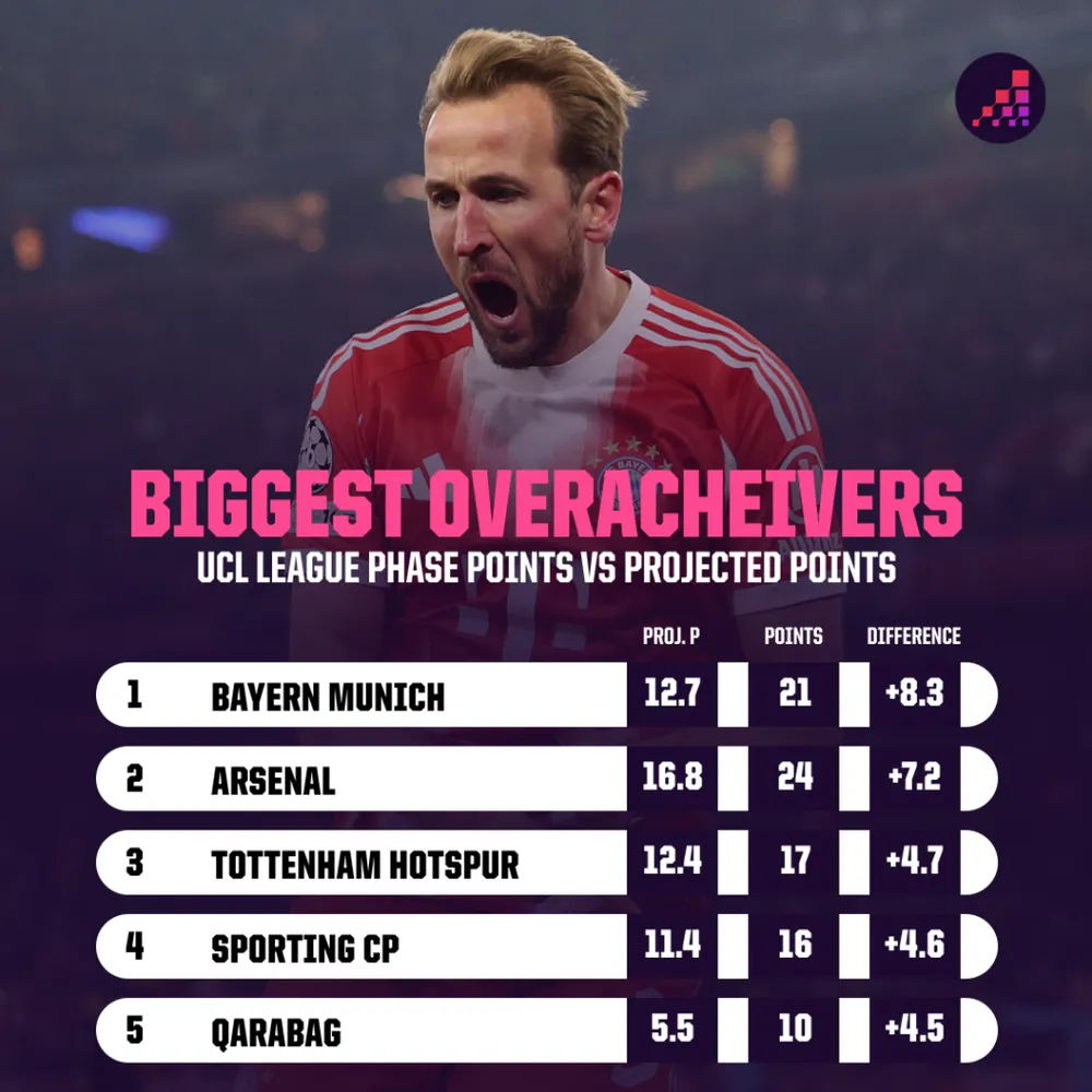Bayern Munich (+8.3 điểm): Thu 21 điểm thực tế so với 12,7 điểm dự báo.