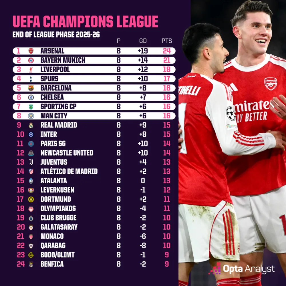 Lần đầu tiên một quốc gia có 6 đội tham dự Champions League, và 5/6 đội Anh vào thẳng vòng 1/8. Liverpool, Tottenham, Chelsea, Man City thắng trận để góp mặt cùng Arsenal – đội đầu tiên thắng cả 8 trận vòng bảng khi hạ Kairat Almaty 3-2 tại Emirates, lập kỷ lục lịch sử với 8 chiến thắng liên tiếp ở thể thức mới. Newcastle hòa PSG dù suýt thắng ở phút cuối (Harvey Barnes bỏ lỡ cơ hội phản công), sau khi Ousmane Dembélé bị Nick Pope cản penalty sớm. Newcastle vào vòng play-off gặp Monaco hoặc Qarabag, tránh được nhiều ông lớn như Real Madrid hay PSG. Premier League thống trị, nhưng vẫn thiếu một suất hoàn hảo.