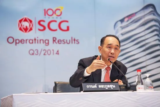 Ông Kan Trakulhoon (ảnh), Chủ tịch và CEO của SCG, tập đoàn công nghiệp hàng đầu ASEAN, vừa công bố báo cáo tài chính hợp nhất chưa qua soát xét của tập đoàn và các công ty thành viên trong quý 3-2014. Trong đó, doanh thu bán hàng đạt 82.850 tỷ đồng (3.872 triệu USD), tăng 9% so với cùng kỳ năm ngoái; lợi nhuận quý đạt 5.231 tỷ đồng (244 triệu USD).