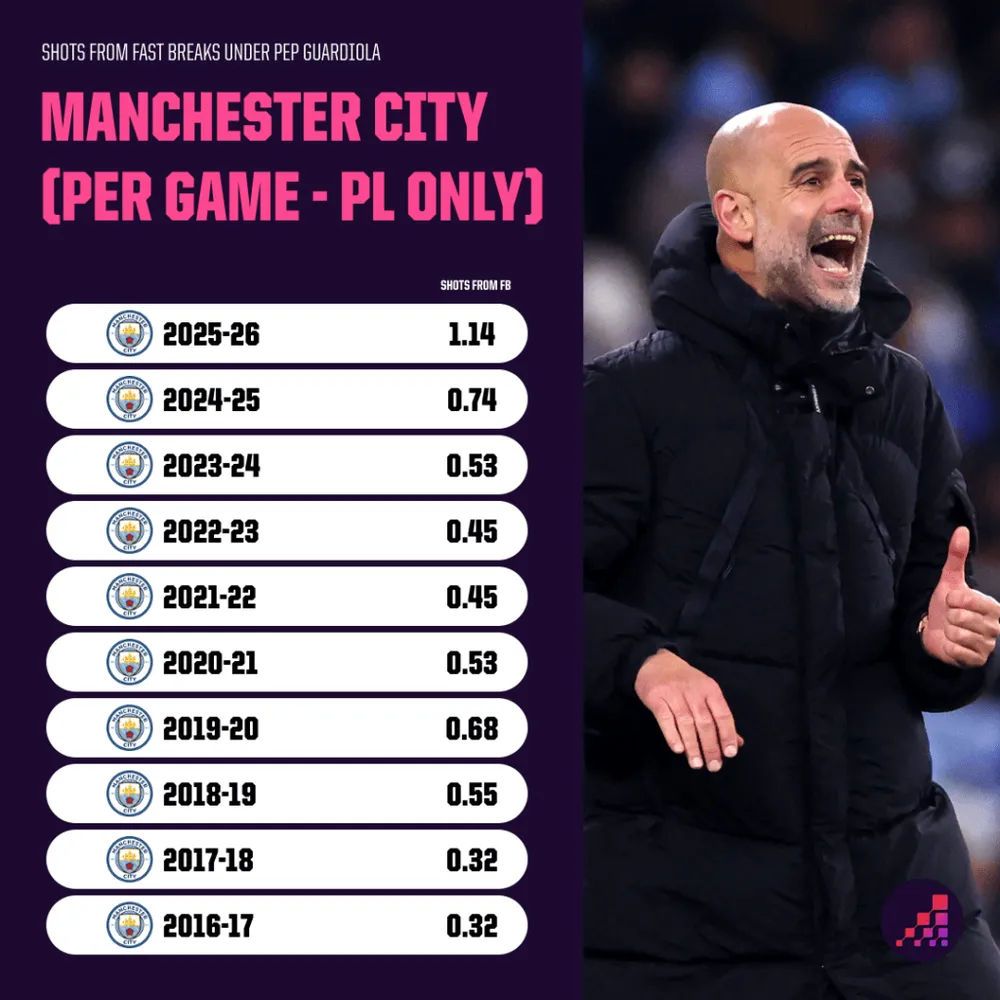 Có một sự thật đang diễn ra tại Man City mùa này: Pep Guardiola đang dần rũ bỏ sự ám ảnh về việc kiểm soát bóng 70% mỗi trận để hướng tới một lối chơi sát thủ hơn. Man City đang thực hiện trung bình 1.14 cú sút từ các tình huống phản công nhanh mỗi trận — con số cao nhất kể từ khi chiến lược gia người Tây Ban Nha đặt chân đến Anh vào năm 2016.