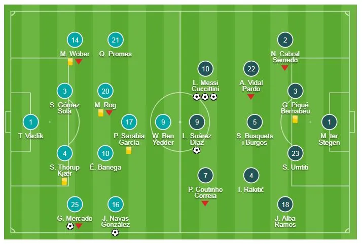 Barcelona: Messi 26', 67', 85', Suarez 90+3'