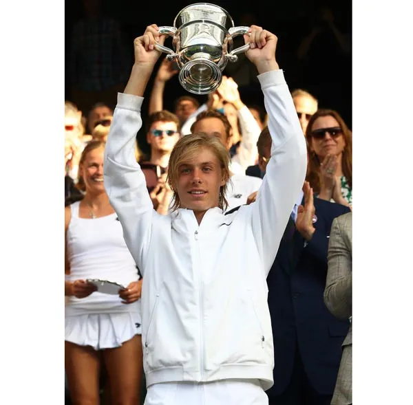 Denis Shapovalov đang giương cao chiếc cúp vô địch đơn nam trẻ của Wimbledon 2016