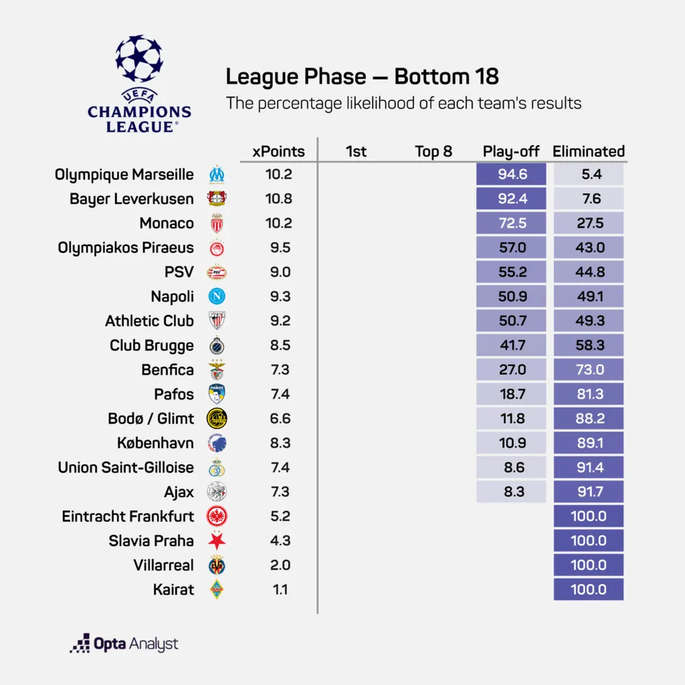 Ai sẽ rơi vào vòng play-off (thứ 9-24)? Đây là danh sách dài và gần như không thể dự đoán chính xác. Theo Opta, 16 đội có trên 50% khả năng rơi vào cửa đấu này, từ những đội gần như chắc chắn như: Galatasaray (99.9%), Qarabag (99.8%), Borussia Dortmund (98.8%)