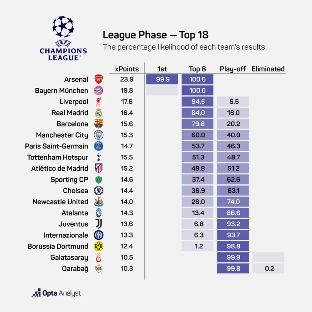 Với thể thức mới, mùa giải Champions League năm nay đang tạo ra một kịch bản chưa từng có: 30 trong tổng số 36 đội vẫn còn cơ hội đi tiếp trước lượt trận cuối cùng. Đây không còn là cuộc đua của vài đội mạnh, mà là một mê cung thống kê nơi hầu hết các ông lớn vẫn chưa thể thở phào. Hiện chỉ có 6 đội đã biết số phận: Chắc chắn vào thẳng vòng 16: Arsenal, Bayern Munich. Chắc chắn bị loại: Eintracht Frankfurt, Slavia Prague, Villarreal, Kairat Almaty.