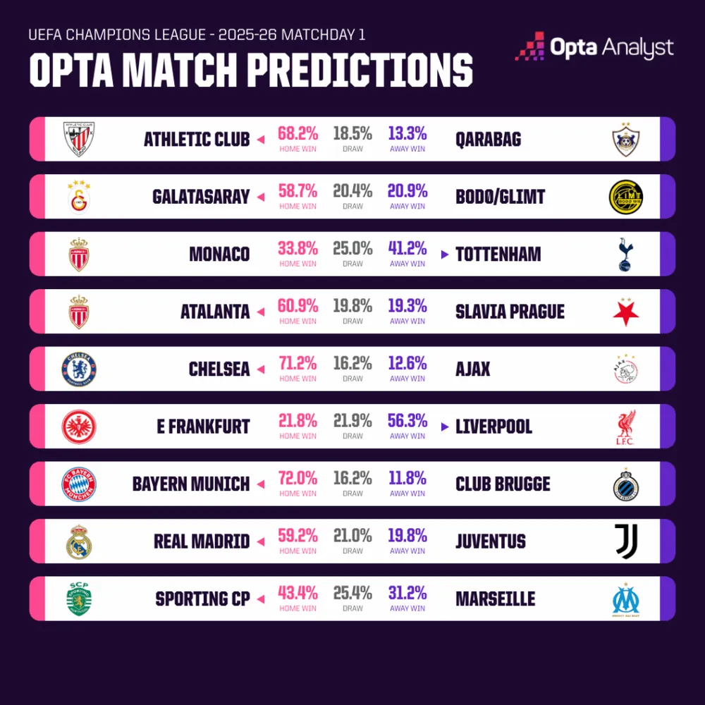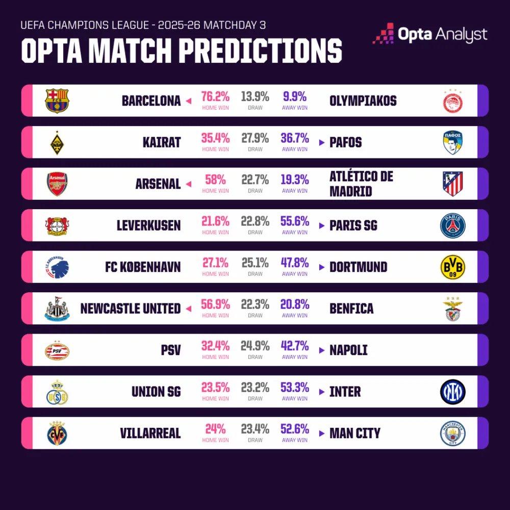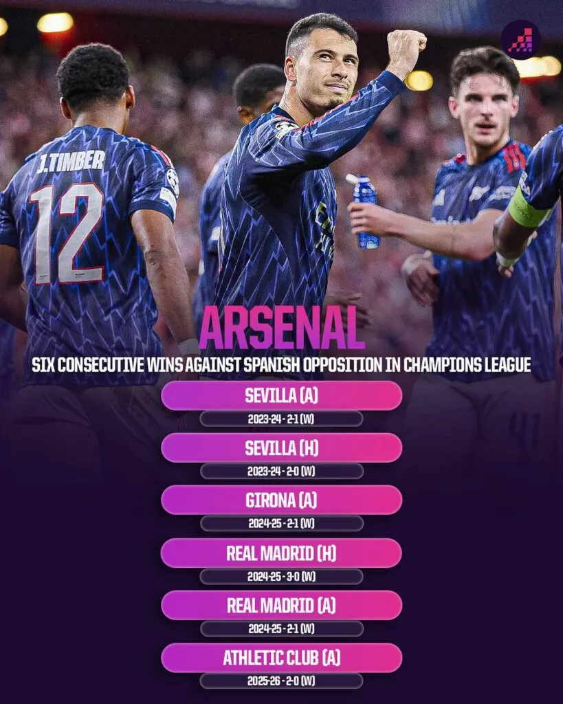 Arsenal (58% xác suất thắng) sẽ rất tự tin, khi đã thắng cả 6 trận gần nhất của họ trước các đội bóng La Liga (Real Madrid x2, Sevilla x2, Girona và Athletic Club). Đây đã là chuỗi trận thắng dài nhất của một đội bóng trước các đối thủ Tây Ban Nha trong lịch sử Champions League.