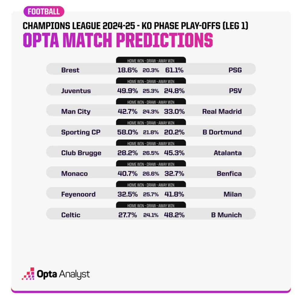 Lượt đi play-off sẽ bắt đầu với một trận đấu toàn Pháp, khi trận đấu sớm diễn ra giữa Brest và Paris Saint-Germain. Brest không được đánh giá cao khi bước vào mùa giải Champions League đầu tiên của họ, nhưng đã khởi đầu tốt, bất bại trong bốn trận đấu đầu tiên và chỉ thua một trong sáu trận đầu tiên. Tuy nhiên, việc đối đầu với PSG trong thời gian gần đây không phải là một trải nghiệm dễ chịu đối với họ – họ đã không thể giành chiến thắng trong 30 trận liên tiếp gặp PSG ở mọi giải đấu (thua 22, hòa 8). Trận thua cuối cùng của PSG trước Brest là vào tháng 1 năm 1985 (1-3 tại Ligue 1), và họ đã đánh bại Brest hai lần trong mùa giải 2024-25 (3-1 trên sân nhà và 5-2 trên sân khách tại Ligue 1). Vì thế, siêu máy tính Opta đang dự đoán PSG giành chiến thắng trong trận lượt đi nhiều hơn bất kỳ đội nào khác trong tám cặp đấu vòng loại tuần này (61,1%).