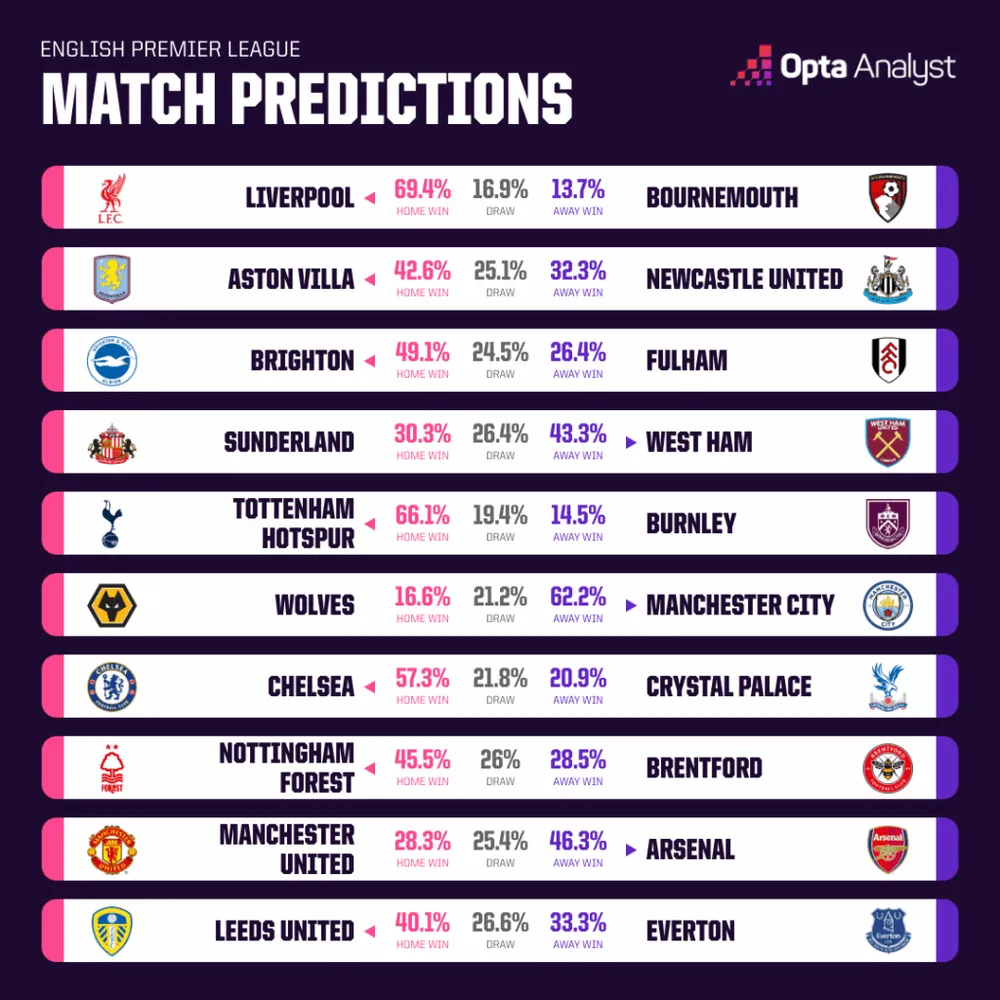 Dự đoán nhanh: Liverpool là lựa chọn tự tin nhất của siêu máy tính ở vòng 1 trước Bournemouth. Siêu máy tính Opta cũng ủng hộ Arsenal và Manchester City mở màn chiến dịch bằng chiến thắng. Leeds United là đội thăng hạng duy nhất được dự báo thắng, với cơ hội chiến thắng của Burnley là thấp thứ hai trong số 20 đội.