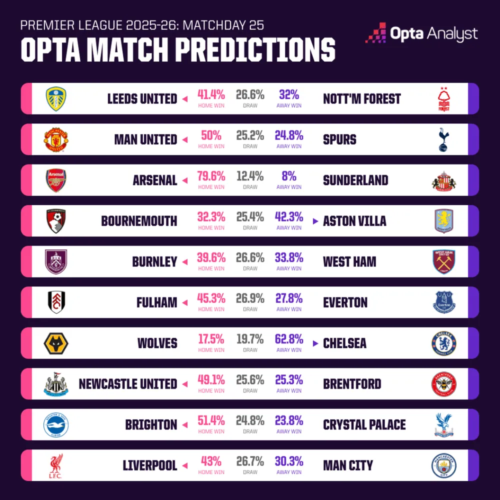 Tiếp theo, Arsenal – đội đầu bảng – tiếp Sunderland tại Emirates trong loạt trận 22g đêm thứ Bảy. Arsenal vừa chấm dứt chuỗi 3 trận không thắng bằng chiến thắng 4-0 trước Leeds, và lọt vào chung kết cúp Liên đoàn sau khi loại Chelsea với tổng tỷ số 4-2. Opta cho Arsenal tới 79.6% cơ hội thắng – con số cao nhất vòng đấu – so với Sunderland chỉ 8%. Arsenal bất bại 18 trận sân nhà gặp Sunderland (thắng 13, hòa 5), và đang giữ kỷ lục bất bại 43 trận sân nhà trước các đội vừa thăng hạng (thắng 38, hòa 5). Nếu không thua, họ sẽ phá kỷ lục của Chelsea (43 trận từ 2001-2015). Sunderland chưa từng thắng tại Emirates ở 16 lần làm khách, và họ chỉ kém Arsenal về số lần làm khách không thắng (Liverpool 17 lần). Mikel Arteta sẽ muốn duy trì đà thắng để giữ khoảng cách với các đối thủ, đặc biệt khi Arsenal đã lọt top 2 bảng xếp hạng Champions League sau chiến thắng 3-1 trước Inter giữa tuần.