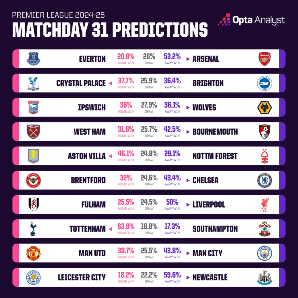 Trong khi đó, trận Crystal Palace gặp Brighton có thể còn căng thẳng hơn. Có sự cạnh tranh khốc liệt giữa hai đội, và siêu máy tính Opta gặp khó khăn trong việc phân định thắng thua tại Selhurst Park, nơi xác suất hòa là 25,9%. Palace thắng trong 37,7% mô phỏng trước trận, trong khi Brighton thắng 36,4%, vì vậy đừng ngạc nhiên nếu kết quả trận này chỉ được định đoạt ở những phút cuối.