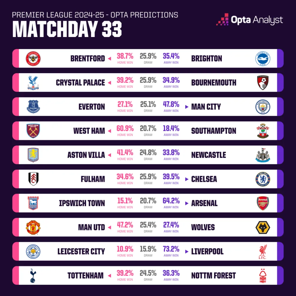 - Arsenal, Liverpool và Man City đều được dự đoán thắng trên sân khách, với đội đầu bảng của Arne Slot là lựa chọn chắc chắn nhất ở vòng 33.