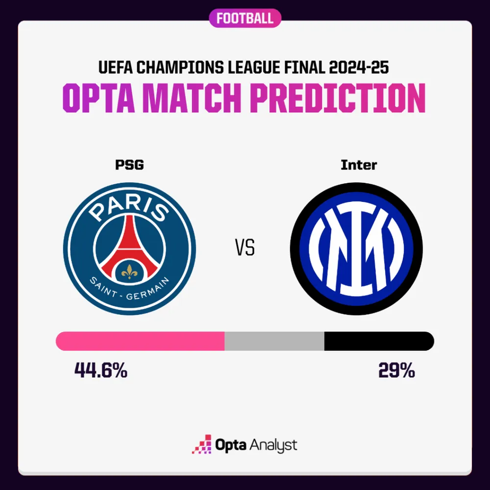 - Paris Saint-Germain là đội được đánh giá cao hơn trong việc giành chức vô địch Champions League lần đầu tiên trong lịch sử, với siêu máy tính Opta dự đoán họ có 58% cơ hội nâng cúp.