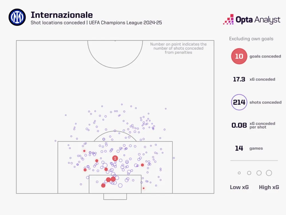 Simone Inzaghi có thể đã “thả lỏng” hàng phòng ngự trong hai lượt trận với đối thủ La Liga, nhưng thành công của Inter tại Champions League mùa này chủ yếu dựa trên nền tảng phòng ngự vững chắc. Họ giữ sạch lưới 8 trận (nhiều nhất giải), chỉ để lọt lưới 11 bàn (gồm 1 bàn phản lưới), trong đó 6 bàn thủng lưới ở bán kết.