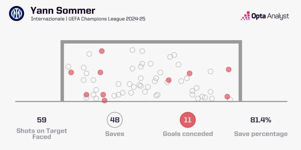 Thủ môn Yann Sommer là nhân tố then chốt trong hàng thủ Inter. Dựa trên chất lượng các pha bóng đối mặt (xGOT), thủ môn người Thụy Sĩ đã cứu thua nhiều hơn bất kỳ thủ môn nào ở Champions League mùa này (+5,9 – chỉ để lọt lưới 10 bàn từ 15,9 xG đối mặt, không tính bàn phản lưới). Sommer dẫn đầu về số trận giữ sạch lưới (7) và chỉ đứng sau Thibaut Courtois (52) và Emiliano Martínez (49) về số pha cứu thua (48).