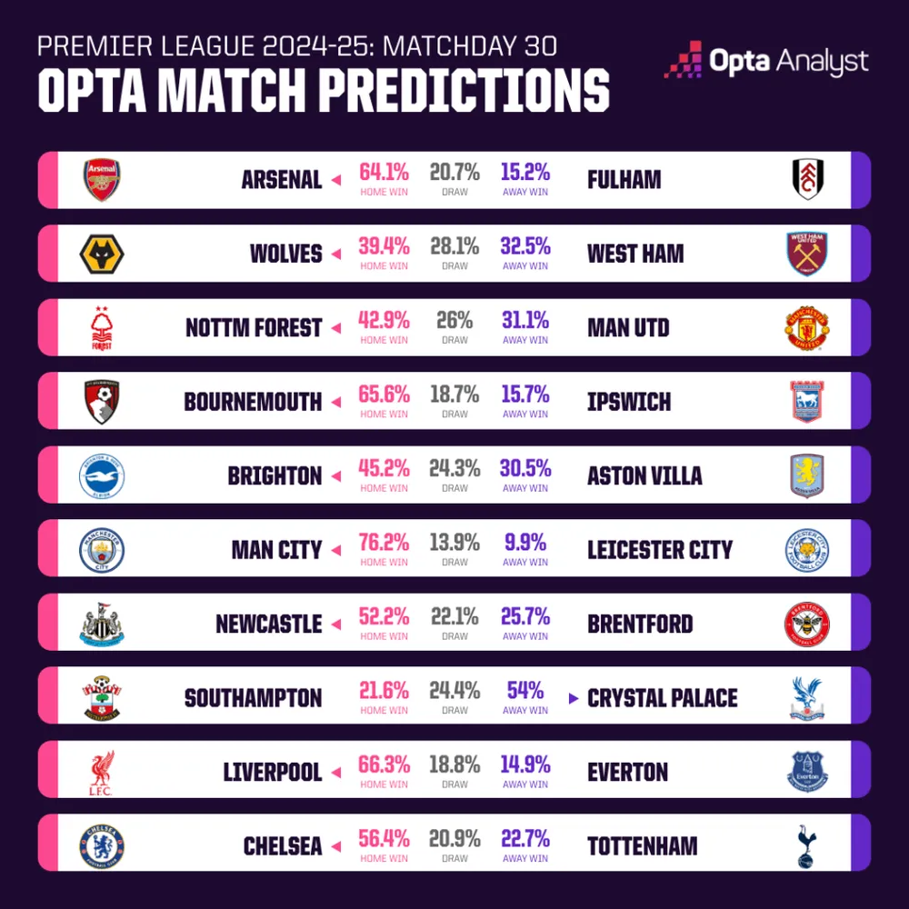 Dự đoán trận đấu Premier League Ngày thi đấu 30 của Opta