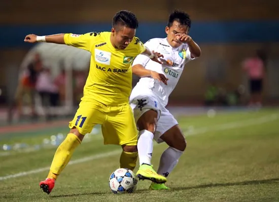 Phi Sơn (trái) tiếp tục là niềm hy vọng của đội bóng SLNA trên hàng công trong chuyến đón tiếp đội bóng thủ đô. Ảnh: Quang Minh