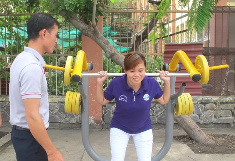 Nhân viên kỹ thuật VIFASPORT hướng dẫn người dân xã Đa Phước luyện tập với thiết bị Gym ngoài trời.