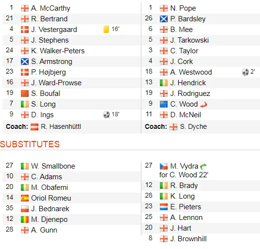 1-1 Phút 18, Danny Ings đã lập công với pha đi bóng ngang mặt thành và cú sút ở mép khu cấm, đưa bóng vào chân cột dọc, bật luôn vào lưới.