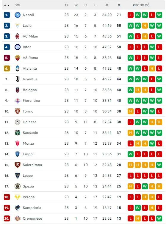 Lịch thi đấu Serie A vòng 29