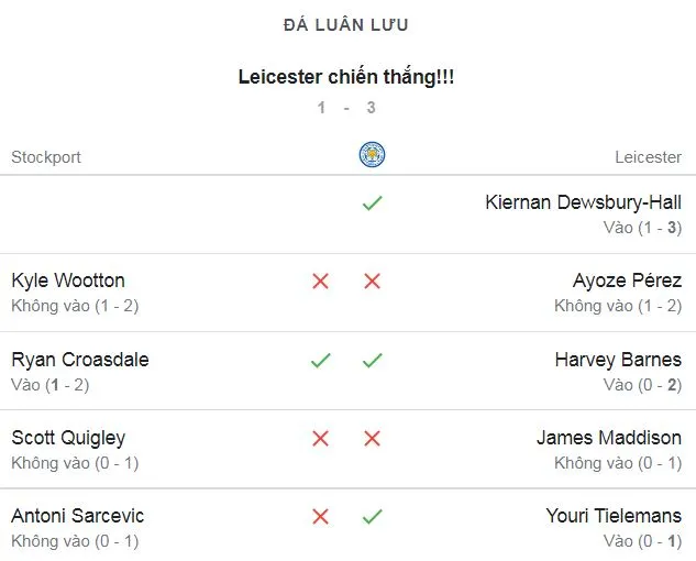 Stockport vs Leicester 0-0 (pen 1-3): Youri Tielemans, Harvey Barnes, Dewsbury-Hall chiến thắng sau loạt luân lưu cân não, giành vé đi tiếp