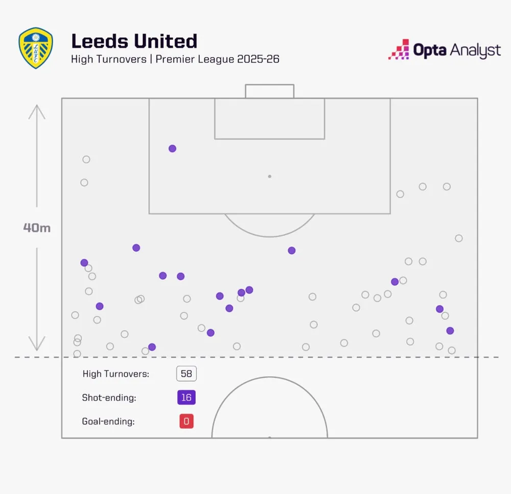 Về tỷ lệ bàn thắng kỳ vọng (xG), Sunderland dẫn đầu Premier League (43%), còn Burnley đứng thứ sáu (35.8%). Thậm chí, dù Leeds không quá nổi bật về xG từ tình huống cố định (21.9%), nhưng 44.4% số bàn thắng của họ lại đến từ các tình huống này, cho thấy sự hiệu quả đáng kinh ngạc.