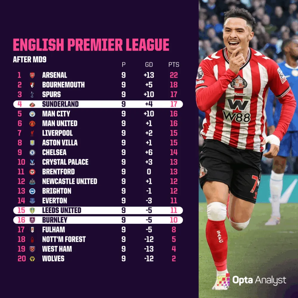 Quan trọng hơn, chuỗi chiến thắng này đã nâng tổng số điểm của bộ ba thăng hạng lên 38 điểm (Sunderland - 17, Leeds - 11, Burnley - 10). Chỉ có hai mùa giải Premier League trước đây chứng kiến các đội thăng hạng tích lũy được nhiều hơn 38 điểm sau 9 vòng: mùa 2005-06 (39 điểm) và mùa 1992-93 (44 điểm).