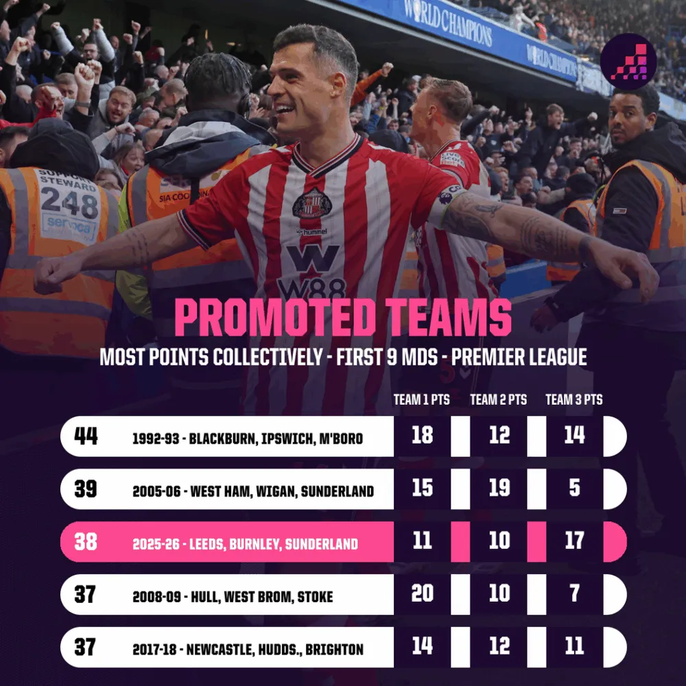 Sunderland chính là gói bất ngờ lớn nhất của mùa giải 2025-26. Với 17 điểm, Sunderland cũng là đội thăng hạng đầu tiên đạt được số điểm này sau 9 vòng kể từ Hull City (20 điểm) mùa 2008-09. Cả ba đội thăng hạng hiện đều hơn khu vực xuống hạng ít nhất năm điểm, một "luồng gió mới" so với các mùa giải trước.