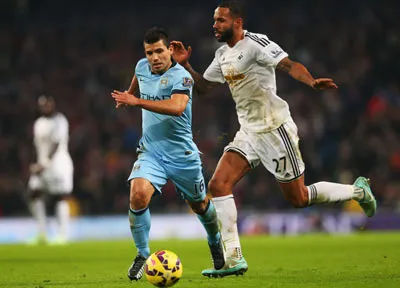 Sergio Aguero (trái, Man.City) vượt qua Kyle Bartley (Swansea).