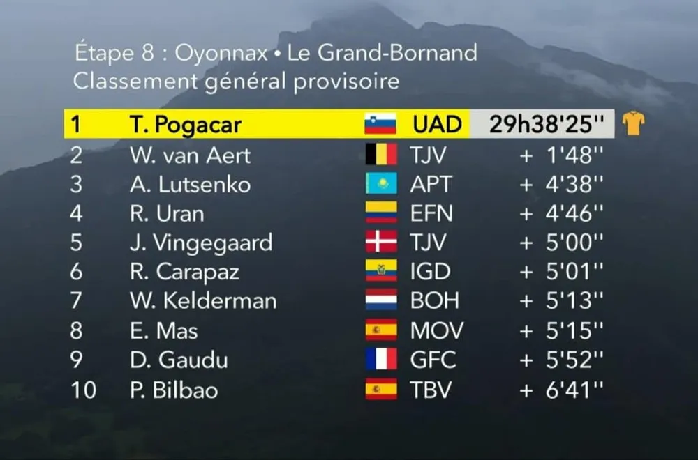 Có thể nói Tadej Pogacar quá mạnh trong thời điểm hiện nay khi anh vẫn duy trì được tốc độ cao khi chinh phục ở cung đường đèo. Từ khoảng cách bị giãn gần 5 phút so với nhóm 1 và 2, một mình Tadej Pogacar tăng tốc rượt theo tốp đầu. Dù để tay đua Dylan Teuns (Bahrain Victorious) solo về nhất chặng với khoảng cách 49 giây, nhưng Tedaj Pogacar có mặt trong tốp 2 với 3 VĐV và anh đứng thứ 4 chặng cũng là kết quả quá thành công. Do áo vàng Mathieu van der Poel về đích sau đó đến gần 21 phút nên Tadej Pogacar vươn lên mặc áo vàng với thành tích 29 giờ 38 phút 25 giây. Wout van Aert (Jumbo–Visma) vươn lên vị trí thứ hai tổng sắp khi kém Tadej Pogacar đến 1 phút 48 giây.