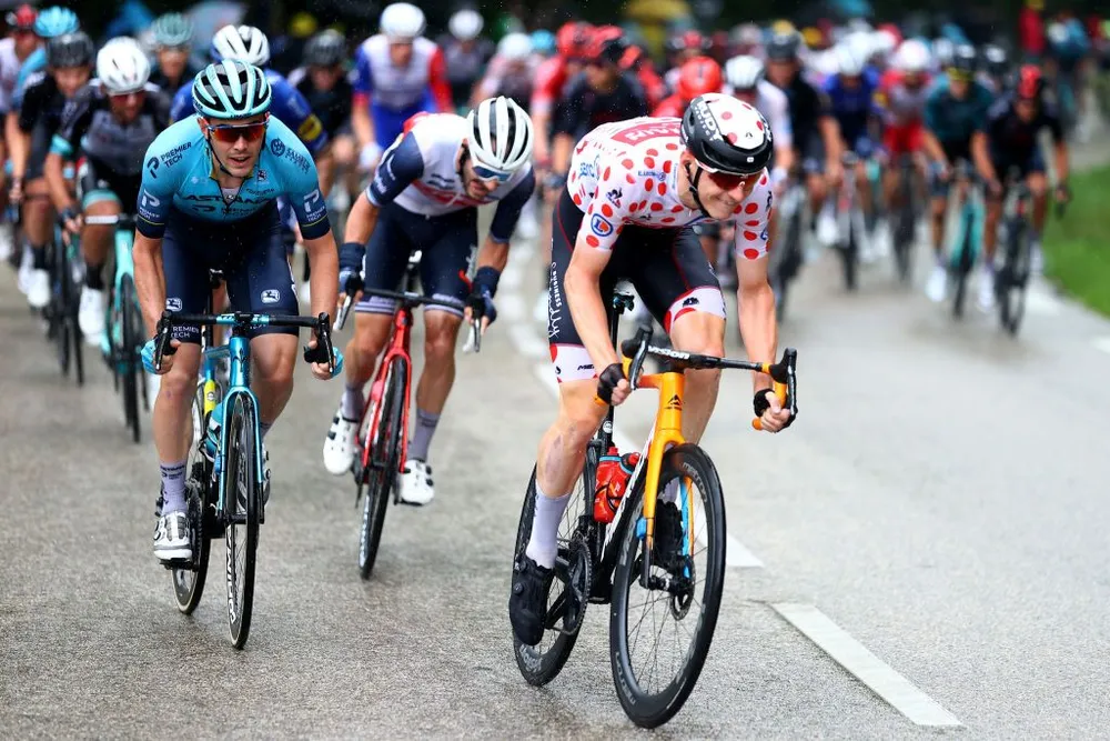 Các đồng đội ở UAE Emirates đang hỗ trợ cho Bước vào đèo Col de Romme có chiều dài 8,8 km và độ cao 1.292 km rất khắc nghiệt bởi độ dốc đến 9%, đó là thời điểm mà UAE Emirates tung ra đòn đánh chí mạng. Họ bắt đầu kéo mạnh với 2 tay đua chủ lực khiến các tay đua không chịu nổi độ dốc lớn từng bước “văng” ra. Và tay đua đầu tiên rơi lại chính là chiếc Áo vàng Mathieu van der Poel. Sau đó, khi mà các đồng đội mình đã tung hết sức hỗ trợ, cũng là lúc cho đương kim Áo vàng Tadej Pogacar thể hiện đẳng cấp. Một cú ra xe tấn công, Tadej Pogacar loại bỏ được tất cả các đối thủ. Chẳng may chỉ có được Carapaz đuổi theo trong tuyệt vọng, chỉ bám đuôi được vài km rồi cũng mất hút.
