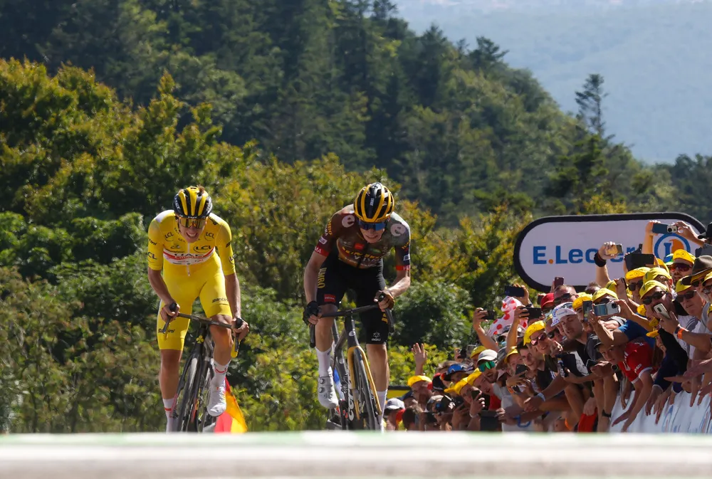 Tadej Pogacar lập tức đứng lên tăng tốc, chỉ mỗi Jonas Vingegaard (Jumbo-Visma) theo kịp cùng thoát đi. Hai tay đua này bắt kịp Lennard Kamna ngay khúc cua cuối, trên con dốc dựng đứng, cách đích chưa đầy 200m. Lúc này, Jonas Vingegaard chớp thời cơ tiếp tục tấn công để lao về đích. Nhưng Tadej Pogacar đã đeo bám và vượt qua đối thủ chỉ khoảng 20m cuối để giành chiến thắng chặng với thời gian 3 giờ 58 phút 40 giây.