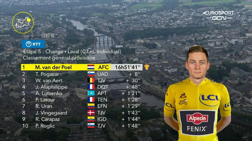 Tuy nhiên, áo vàng Mathieu van der Poel (Alpecin-Fenix) đã có một ngày thi đấu đầy nỗ lực, vượt trên cả khả năng của mình để kháng cự thách thức đến từ Tadej Pogacar. Kết quả là tay đua Hà Lan đã cán mức ở vị trí thứ năm, kém Tadej Pogacar chỉ 31 giây. Với kết quả này, Mathieu van der Poel đã giữ được áo vàng tổng sắp với thành tích 16 giờ 51 phút 41 giây.