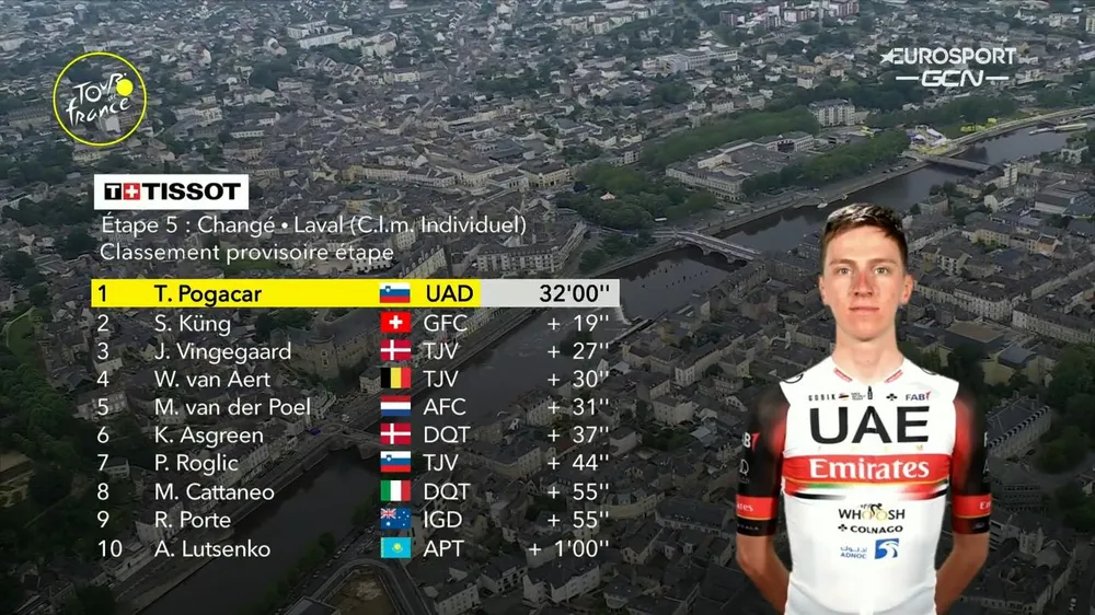 Sau 4 chặng đầu tiên khá im tiếng, đương kim vô địch Tour de France 2020 Tadej Pogacar đã toả sáng ở nội dung sở trường cá nhân tính giờ. Anh hoàn tất lộ trình 27 km từ Changé đến Laval với thời gian 32 phút, đạt tốc độ trung bình khoảng 51km/h. Thành tích của Tadej Pogacar hơn HCĐ cá nhân tính giờ thế giới Stefan Kung (Groupama-FDJ) đến 19 giây.