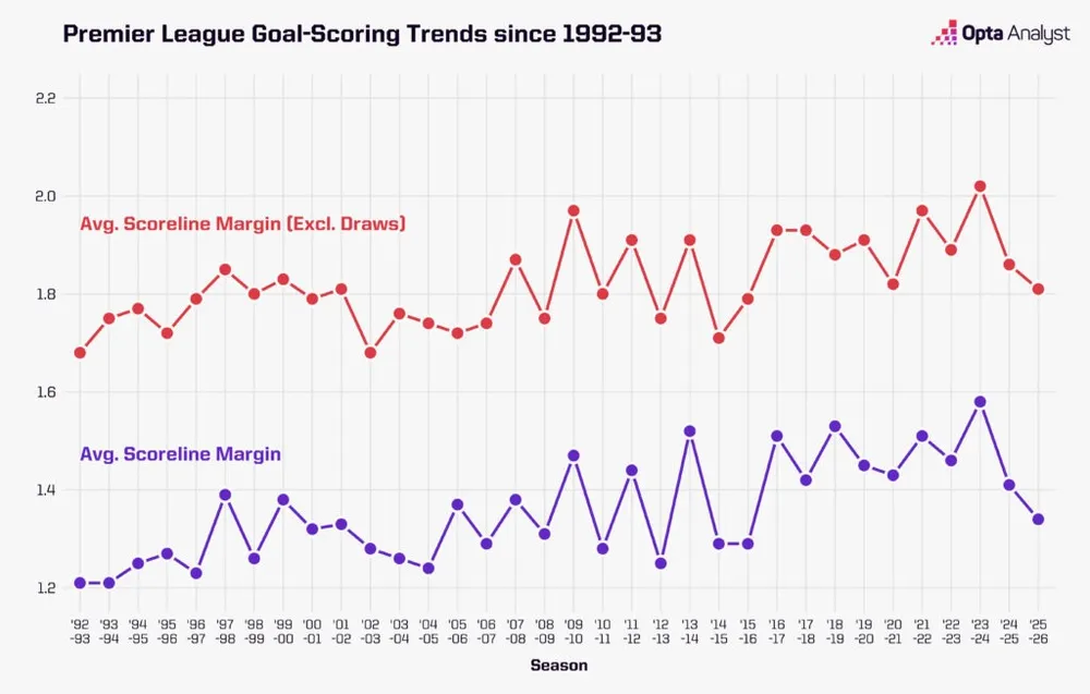 Tuy nhiên, giờ đây nó đang ở mức thấp nhất trong một thập kỷ, với các đội bị cách biệt trung bình 1,34 bàn ở mùa 2025-26. Có vẻ như, ít nhất là đến nay, không có "đội lót đường" ở cuối bảng xếp hạng mùa này, và những chiến thắng lớn hiếm hơn. Lần cuối cùng mức trung bình thấp như hiện nay là mùa 2015-16, khi không có đội dẫn đầu vượt trội và các đội mạnh nhất Premier League cân bằng đến mức một đội ngựa ô với tỷ lệ 5000-1 như Leicester City đã vô địch.