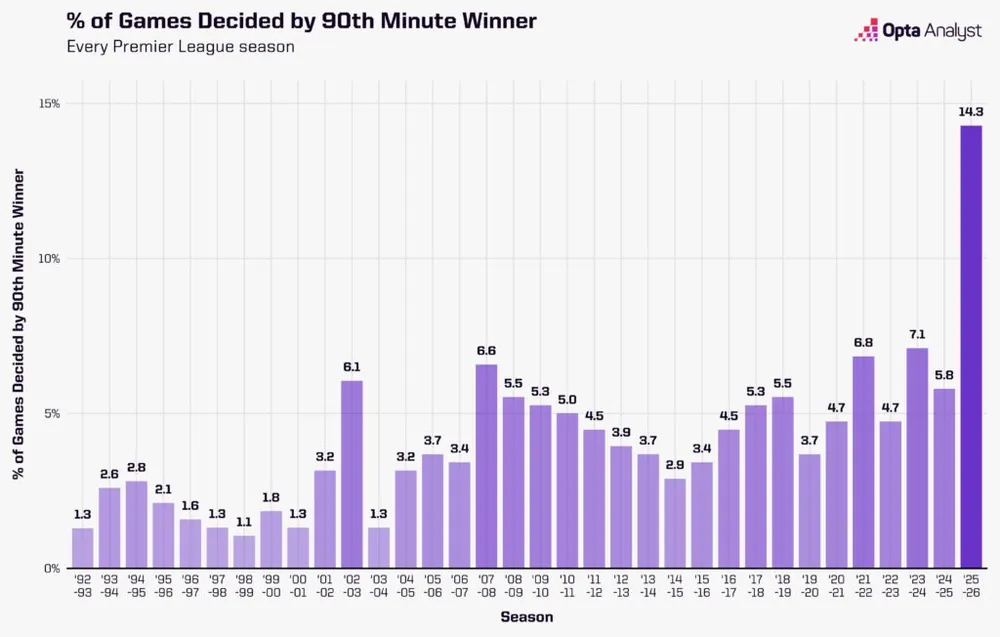 Điều đáng kinh ngạc nhất là 14,3% tất cả các trận đấu mùa này đã được quyết định bởi bàn thắng phút 90, cao hơn gấp đôi so với bất kỳ mùa giải nào khác trong kỷ nguyên Premier League. Mức cao nhất trước đây trong bất kỳ mùa giải đầy đủ nào là 7,1% ở mùa 2023-24, mùa giải mà, như đã lưu ý, thời gian bù giờ dài nhất.