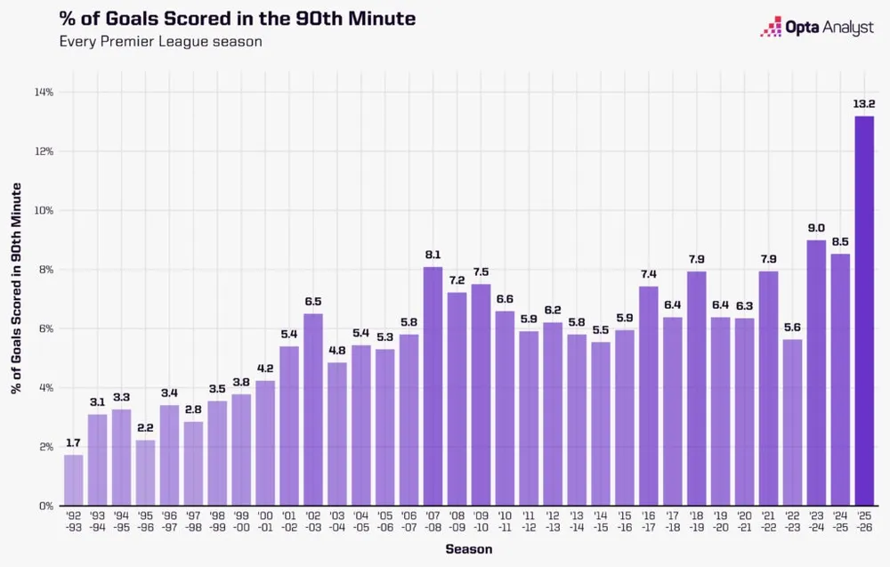 Tuy nhiên, mặc dù các trận đấu ngày nay kéo dài hơn, nhưng điều đó thôi chưa đủ để giải thích những gì đang xảy ra ở mùa giải này. Mùa giải 2025-26 đang sản sinh ra nhiều bàn thắng ở phút 90 hoặc muộn hơn bất kỳ mùa giải nào trong lịch sử Premier League, và còn hơn thế nữa: tỷ lệ các trận đấu được quyết định bởi bàn thắng phút 90 đang cao hơn bao giờ hết.