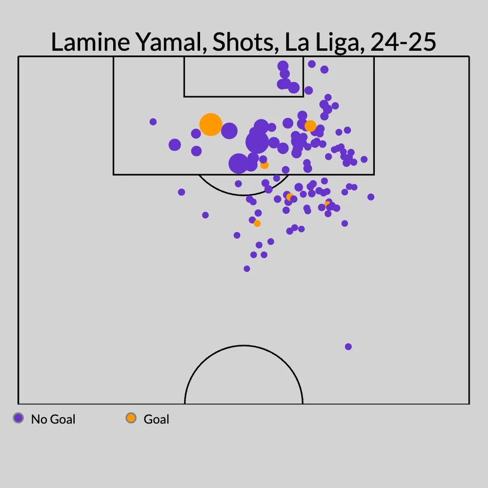 Yamal sút nhiều từ ngoài vòng cấm, và hiếm khi vào trung tâm vòng cấm. Đây có lẽ là khía cạnh “bình thường”. Hầu hết các cầu thủ trẻ sút nhiều cú sút tệ, và sau đó họ dần giảm số lần sút để chọn những cơ hội chất lượng hơn khi lớn lên.