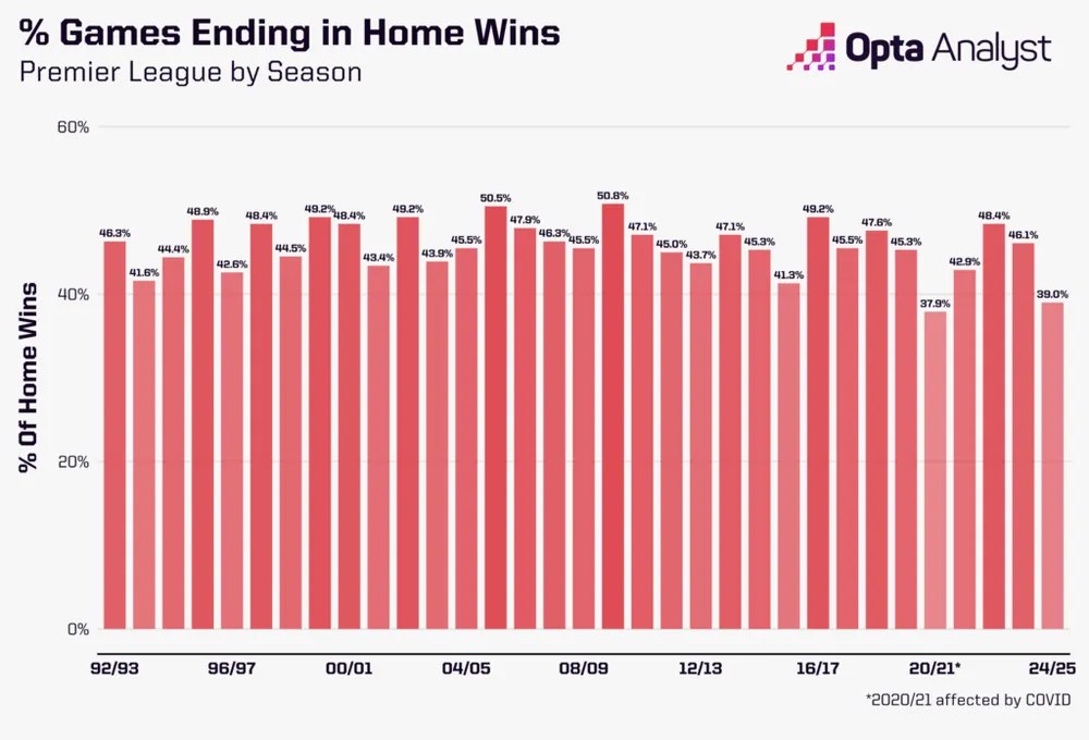 Hiện tại chưa thực sự trở lại với những cấp độ đó, nhưng mùa giải 2024-25 chứng kiến ít chiến thắng trên sân nhà hơn bất kỳ mùa giải Ngoại hạng Anh nào khác ngoài chiến dịch bị COVID tấn công.